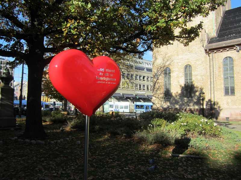 ”Suurin kaikista on rakkaus.” Taustalla Oslon tuomiokirkko. Kuva: Meri Liukkonen