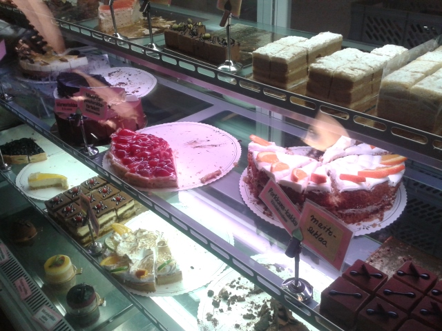 Kahvila ei ymmärrettävistä syistä ehkä ollut varautunut yli kymmenhenkisen porukan invaasioon eikä varsinkaan kyltymättömään kakun ahtamiseen pienen kisan siivittämänä. Hyllyt alkoivat lopulta ammottaa puolityhjinä. Reilu tunti ennen sulkemisaikaa tarjolla oli silti vielä yhdeksää erilaista kakkua, perunaleivoksia ja runebergintorttuja.