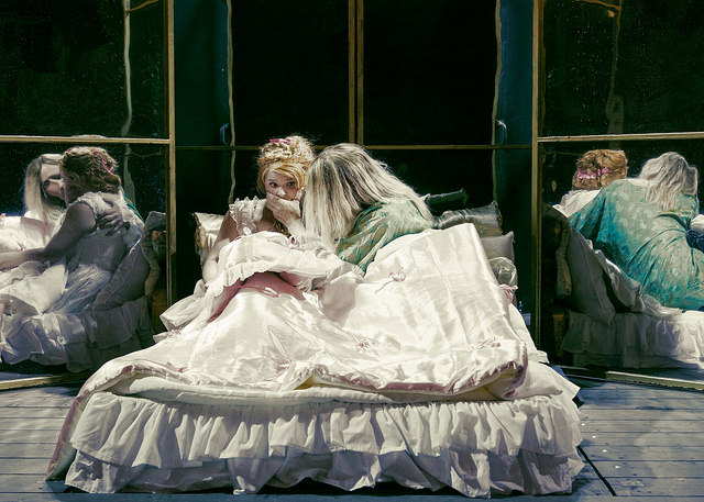 Lämpimät kiitokset Ryhmäteatterille lipuista! Tämän kirjoituksen pääkuvassa markiisitar de Merteuil (Minna Suuronen) punoo juoniaan muiden pään menoksi. Kuva: Ilkka Saastamoinen / Ryhmäteatteri.