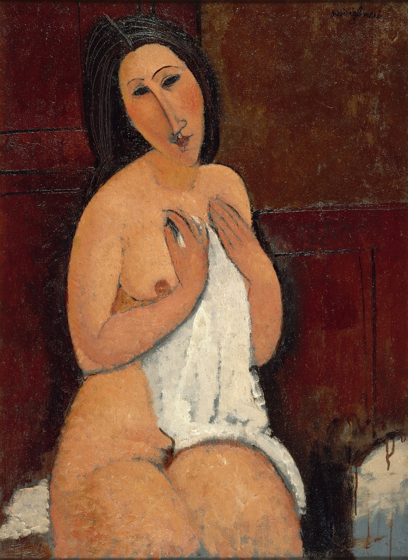 3. Silmät, sielun peili? Minua jäivät askarruttamaan Modiglianin maalaamien muotokuvien silmät. Sanotaan, että silmät ovat sielun peili. Modigliani maalasi silmät usein mantelinmuotoisina, mutta tyhjinä, jopa täysin mustina. Hyvä esimerkki silmistä on vaikkapa tässä suoraan yllä, teoksessa Istuva alaston ja paita, joka on lempiteokseni Ateneumin näyttelystä.