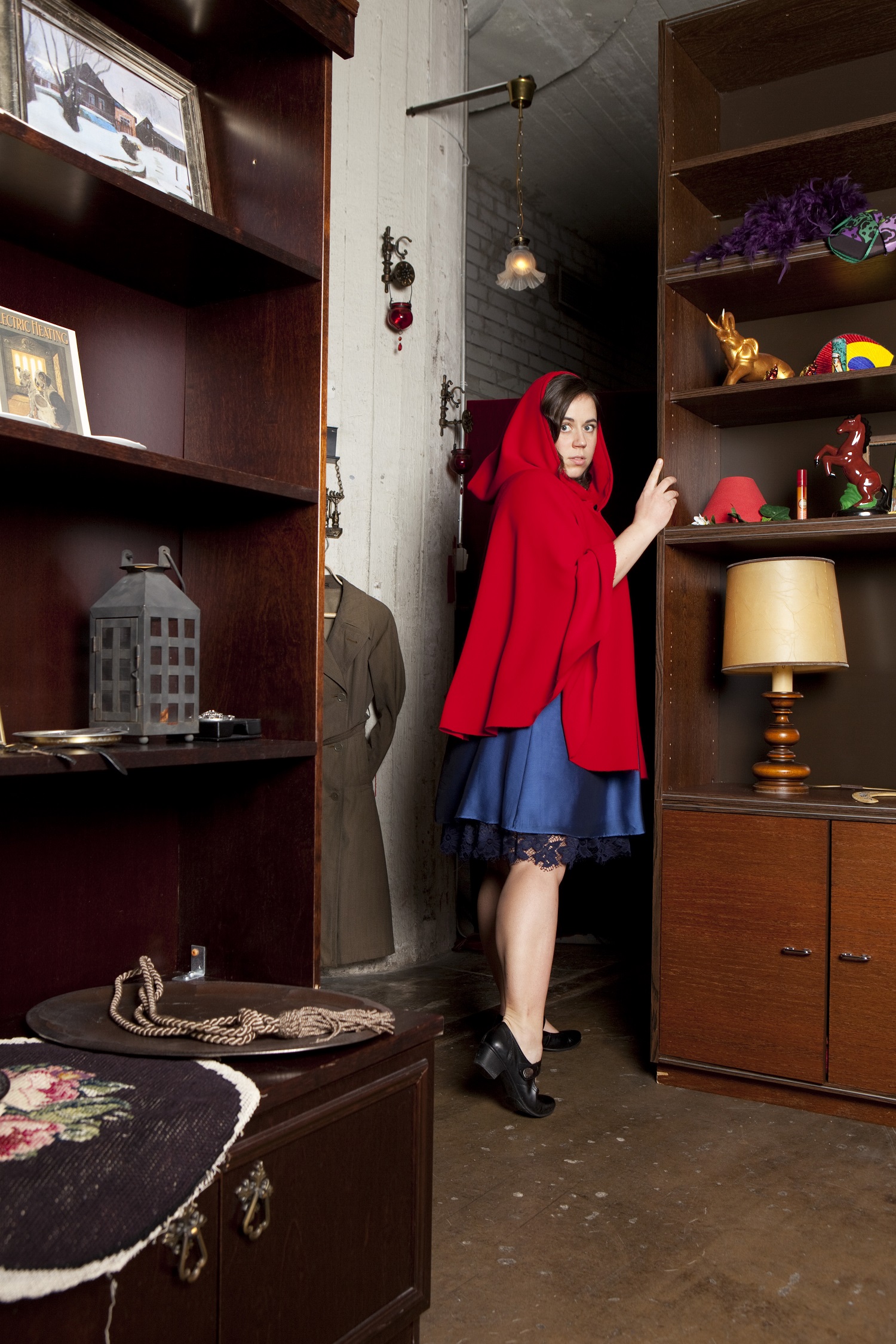 Punahilkka (Pauliina Palo) on tässä sadussa aivan toisenlaisessa roolissa kuin perinteisesti. Kuva: Kristiina Männikkö